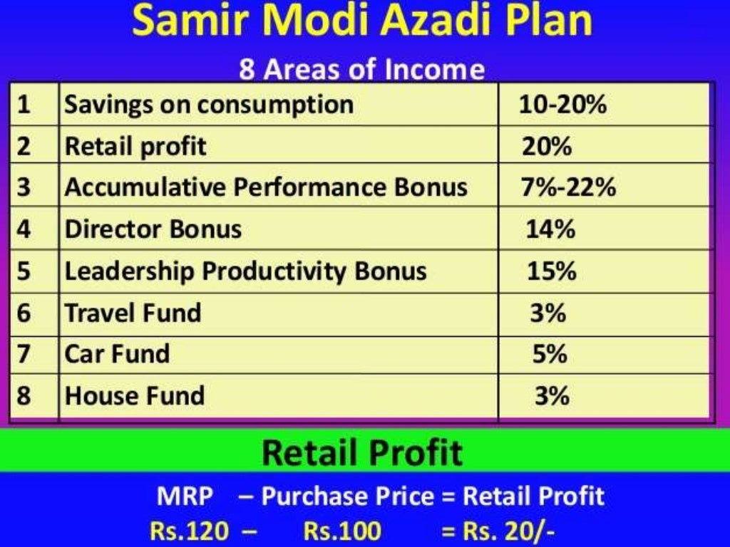 Abbreviated Details Of Modicare Business planRetail Gain 20% –. Retail profit is the first income of this company. ...Saving On Consumption 20% –. This is the second income given by the company. ...Accumulative Execution Bonus 7% – 22% –. ...Director Bonus 14% –. ...Leadership Productivity Fillip 15% –. ...Outbound Travel Fund 3% –. ...Dream fomite Fund 5% –. ...